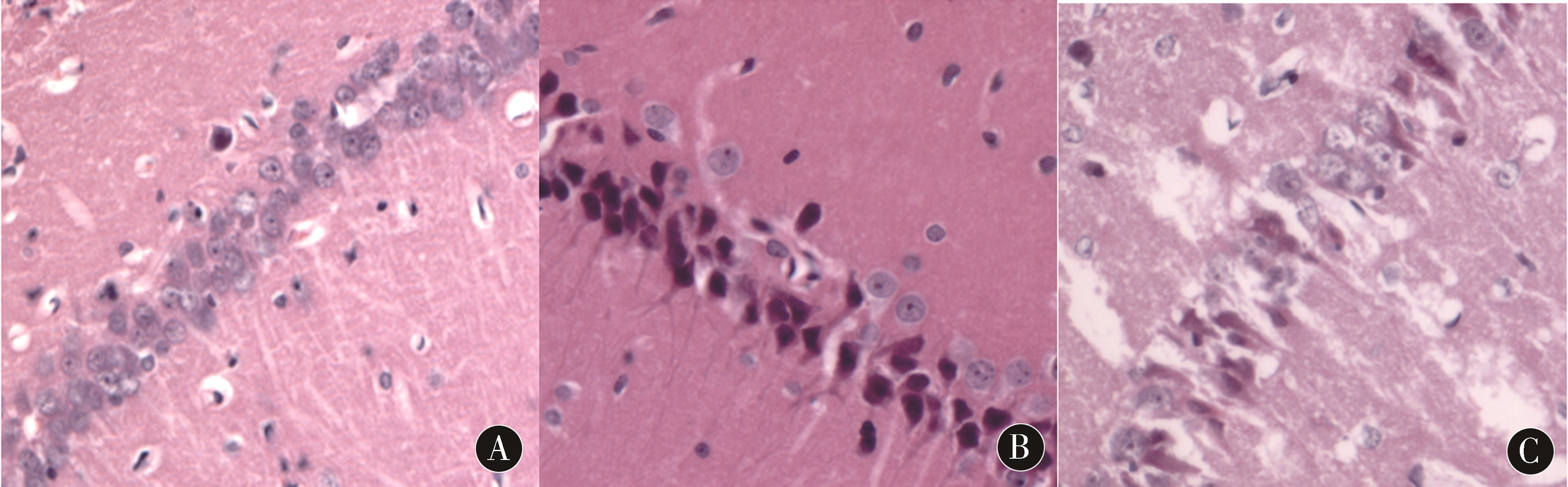 1.4 HE染色 切片常规脱蜡至水,经苏木精水溶液染色及1%盐酸乙醇分化后,水化返蓝30 min,0.5%伊红溶液复染,再经梯度酒精脱水二甲苯透明后由中性树胶固定封片。结果判定与计数:每个时间点随机选取4只大鼠,每只大鼠选取5张切片,光学显微镜(40×10)下随机观察5个不重叠视野。可见坏死神经元细胞核变形或消失,胞核深染,细胞排列疏松,间质水肿;存活神经元细胞核仁明显,排列整齐。采用Motic6.0数码医学图像分析系统计数海马区存活与坏死神经元细胞个数,坏死率为坏死神经元细胞与总神经元细胞之比,取其平均值进行统计分析。